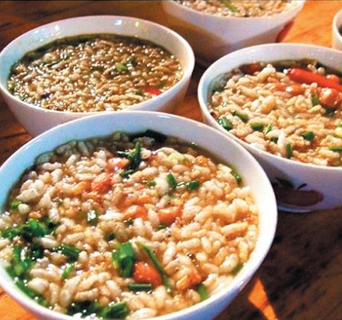 油茶很讲究吃法,吃时不用筷、勺等餐具,而是一手端碗沿着碗边转圈喝。