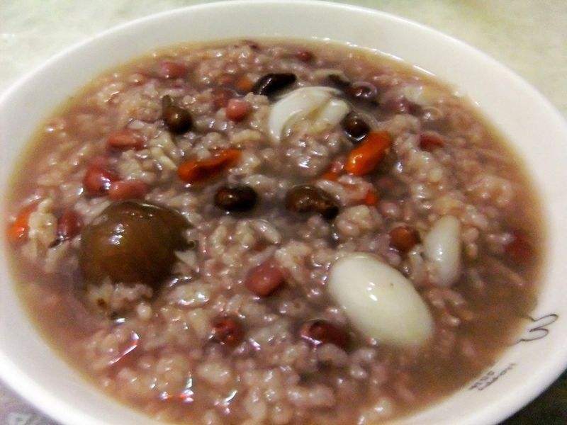 做法步骤:1. 配料:蕨麻2把、枸杞十几颗、小红豆3把、干百合十几片、龙眼5颗、大米半罐。(煮出来大约够2个人吃一顿的量)
