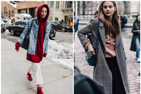 第二款是将卫衣作为内搭,卫衣是极具嘻哈感和运动感的单品,在单穿的时候也非常有的青春活力的感觉,作为内搭会有更多的可能性,将层次感打造出个性特征。