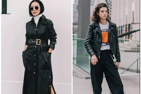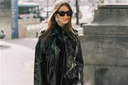 而近年特别流行的漆皮外套特有的光泽感也十分容易带来膨胀的效果,选择黑色不仅能让穿搭显瘦,而且比彩色漆皮更容易穿出高级感。一身的黑色加上闪钻的装饰华贵典雅,长风衣又有一些帅气的特色,黑墨镜让整体搭配看起来更加有气势。