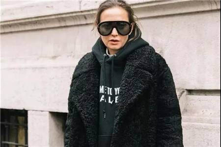 黑色最适合用在那一些本身容易显胖的衣服,比如像泰迪外套的绒毛感会带来臃肿的感觉,黑色可以很好地减轻视觉上的负担,让视觉转移到内搭的颜色上,会带来削瘦的感觉。长大衣直到脚踝,配上白色字母的连帽卫衣,层次感主要叠加在领口的位置。长衣摆带来的垂坠感让下半身显得更加修长。