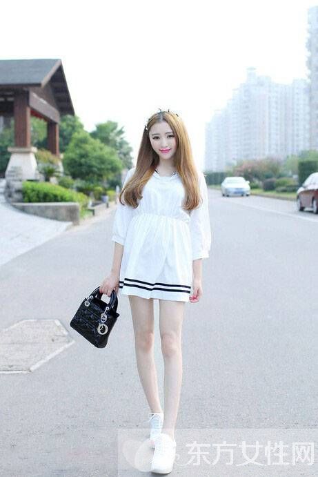 秋季款七分袖连衣裙,很有海军学院风的裙子,而且宽松的高腰裙摆,又能遮住肉肉,配上双小白鞋,给人乖乖的感觉。