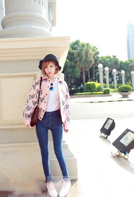 一款宽松的可爱猫咪印花外套,内搭T恤+高腰牛仔裤,将T恤束进去穿,拉长了腿型,隐藏小腹,而外套又遮住了肉肉的上身,显瘦NO.1的!