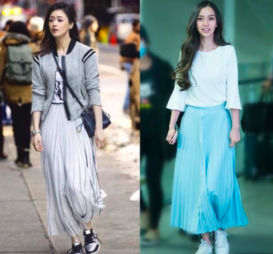 女神们也是很喜欢百褶裙呢,打出不同的风格。女神angelababy 穿百褶裙是超仙超美的,我们的华妃娘娘穿出了帅气随性的感觉呢。喜欢甜美风,小清新的可以搭配粉色,或者蓝色这种温柔色系的颜色。