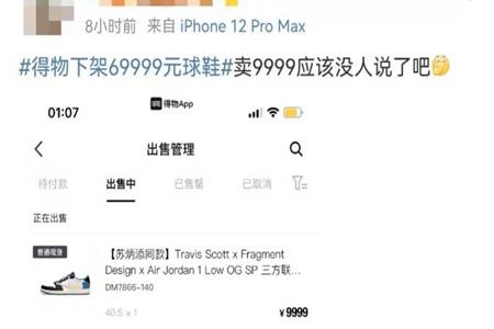 天价球鞋卷土重来!近日,网友在微博中爆料称,在得物上一双发售价1599元的球鞋最高炒到69999元。据悉,此次被爆炒的“闪电倒钩”是音乐人Travis Scott、Fragment Design藤原浩和Nike Air Jordan三方联名商品,共发售两款,一款为高帮鞋,另一款为低帮鞋,发售价为1599元。该事件出来后,瞬间引发诸多热议。