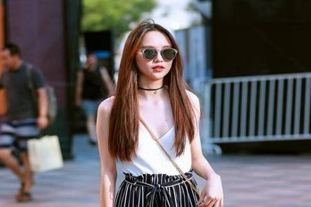 清凉性感的白色吊带衫,配搭气场满满的中性黑白条纹高腰阔腿裤,简约的搭配,完美诠释美女的性感和优雅,彰显出时髦又摩登的格调,别有一番韵味。脚踩黑色高跟鞋,恰好地提高了整体的时髦感,从视觉看充满了夏日风情。