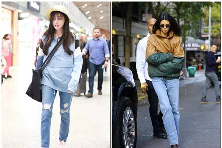 选择紧身裤子搭配的女生对腿部线条的要求比较高,牛仔裤同样是很好的选择。张天爱的浅色小黄帽搭配颜色同样清浅的蓝色穿搭,看起来特别清新。蓝白条纹和牛仔破洞的装饰在配色上也非常搭调,粉白色鞋子尽展少女感。肯豆的大长腿穿上直筒牛仔裤显得比例更加优越。棕绿色块拼接的防风衣版型蓬松,厚领十分有特色。在整体上十分有复古的味道。