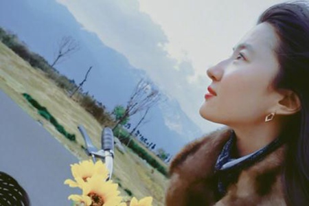 不仅有和油菜花的合影拍照,还有刘亦菲在乡间的道路上骑着自行车飞驰。有趣的是,在刘亦菲的自行车上还有几朵向日葵,刘亦菲则拍了自己的侧脸照。