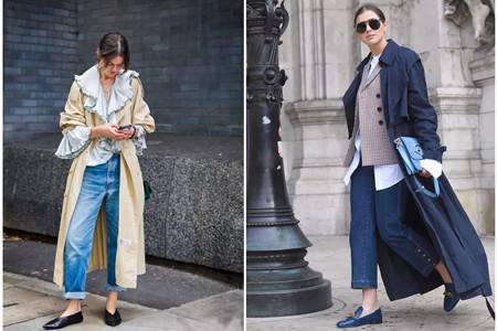 浅色的长外套往往视觉上没有那么大的压迫感,小米色衬肤又百搭成为长风衣的首选,轻薄的面料在内衬的宽大荷叶边下更像点缀。浅蓝色的缎面衬衣宫廷范儿十足,肩膀皱褶一直延伸到胸前成为花边。外套的袖口堆拉倒喇叭袖口上面,衬衣和外套融为一体,典雅的配色给人舒服的感觉。搭配休闲的高腰牛仔裤,宽松的裤管卷起一截裤脚增加厚度,脚踝在V口鞋的延伸效果下变得更加纤细。长外套和平底鞋搭配,一定要注意露出部分肌肤来分割视觉上严密的包裹感。