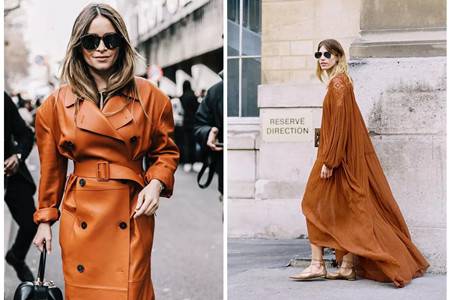 棕褐色过于压抑,而且对肤色也不够友好,当是加入了橘调之后就变得亮丽很多。橘色明艳,纯色容易俗气,增加暗沉色调之后也变得稳重很多的,显得十分大气时尚。橘棕在不同面料下也质感也有很大的变化。