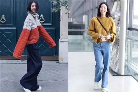 阔腿裤其实是一种非常显气质的裤子,除了会让女生变高,而且还能够让女生的气质变得清冷优雅,带有复古的感觉。大表姐穿阔腿裤即使没有跟鞋的加持也足够高挑,和各种毛衣的搭配更是让人觉得慵懒又适,亲切得没有距离感。深蓝色阔腿裤配上一双白鞋,随性不羁,绝佳的比例令人羡慕。灰红拼色的高领毛衣粗织纹理,同样是宽松的版型,但是在下摆有所收束,才不会有上宽下宽的感觉。