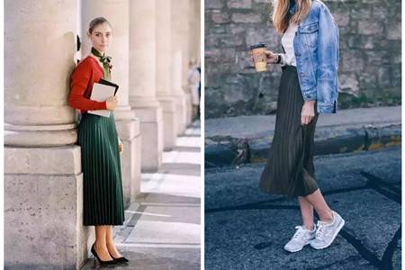墨绿色长裙也是作为搭配的好选择,上下分离更显比例。红色单衣在肩领上十分有特色,皱褶打造优雅的弧线,绿色百褶裙十分优雅,配上一条丝带十分有复古的感觉。长裙搭配运动鞋更加随性,白色T恤搭上一件牛仔衫外套,飘逸的裙摆流露着女性的美丽。