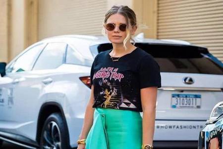 迷笛裙+短袖的这个搭配,整体看起来很随意也惬意,譬如:上半身一件黑色印花款宽松短袖,下半身搭配一款深绿色迷笛裙,清爽端庄之美呼之欲出,不规则裁剪款式还增添了前卫风格。