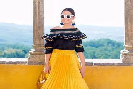 亮黄色迷笛裙,加入了百褶元素,更利于突显自由洒脱风尚,搭配米色精简高跟鞋,则更突出清新时髦婉约感。其中,黑色一字肩衬衫款式新颖,黄蓝色三种色调的波浪条纹做点缀,因此就将清爽风情和艺术之美完美融为一体。