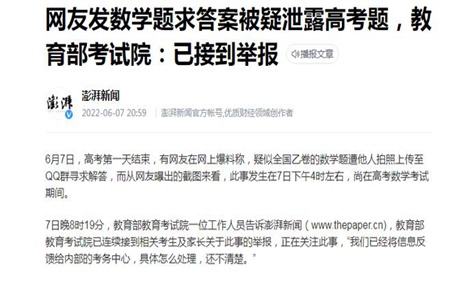 不久后,教育部教育考试院发布景遇传递称,经公安机关敏捷侦察,现查明:涉数学全国乙卷事,系考中作弊,甘肃某考生背规携带手机进入科场,开考后拍摄试卷发至QQ群寻求解答未果,不存在考前泄题。