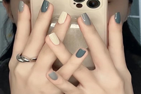 6、 Ins风的极简美甲,是雾霾蓝、浅灰色和奶白色,灰蓝色系三色拼集出来的跳色美甲,这个配色属实是又奶又高级,清新又冷漠。清秀气秀的太合适春夏日啦,很有气质。