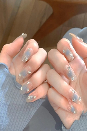 5、 一样是一款蓝色系的美甲,不外这款加倍少女。腮蓝加上闪钻点缀,色彩异常清透,整体式子十分显白显嫩。对底色有其他想法主张的小仙女们,也能够DIY这个式子哦。