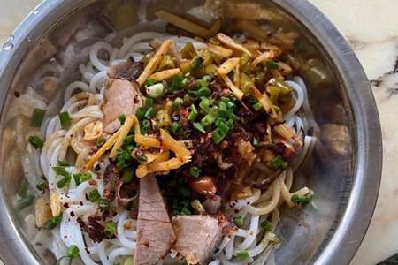 生活生计中,做粉时米粉过滚水后放碗中,加少量油,适当卤牛肉、锅烧、配菜,最后到场半勺卤水。由于熬卤水时加了牛骨髓,所以卤水自带必定粘性,拌匀后,会附着在每根米粉上,平均入味,成为本来寡淡的米粉的味魂。