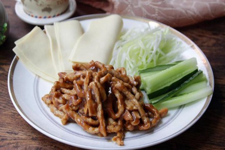 京酱肉丝:猪里脊肉250克、黄瓜1/2根、鸡蛋清1/2个、油盐适当、葱白2棵、姜1块、甜面酱4汤勺、料酒1汤勺、白糖1/3汤勺、胡椒粉1茶匙,淀粉适当··