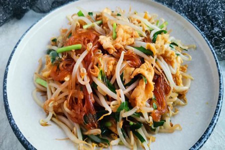 炒合菜:绿芽菜250克、鸡蛋2个、韭菜1把、粉丝1把、油盐适当、姜2片、米醋几滴、生抽1汤勺··