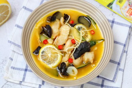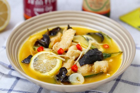 该道酸汤鱼主食材为鱼肉、木耳、金针菇和黄瓜,成品酸辣开胃热量相对较低,减脂期适当食用也不会发胖,而且做法简单,几分钟就可以煮好一锅,吃起来解馋又过瘾!