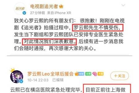 关于罗云熙拍戏意外受伤事宜,电视剧《追光者》剧组在微博上针对罗云熙受害突发事宜泄漏显示:“今晚,剧组拍摄的内容中,触及到争执戏份:罗云熙所饰演的罗本因过失踪导致队友重伤急救无效,其队友年夜鹏因出于气愤挥拳打向罗本。因对手演员未控制好力度及平安距离,导致罗云熙意外受伤。罗云熙师长教师已于第一时候在医院进行医治措置责罚,今朝已无年夜碍。对罗云熙师长教师及一向支持我们的粉丝同伙报以真诚的歉意。”