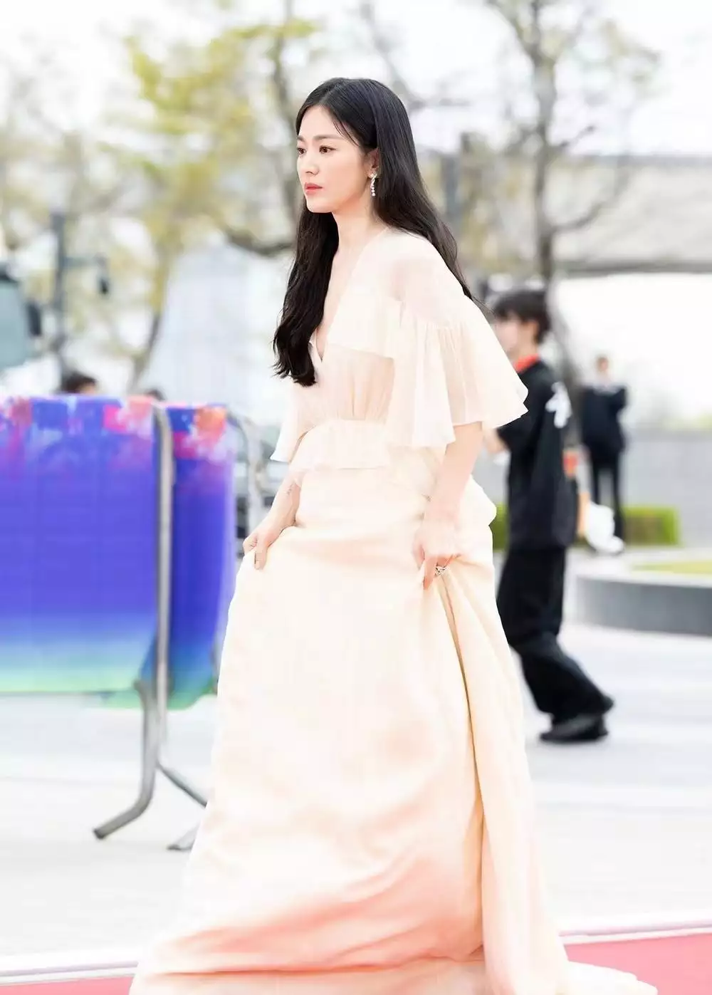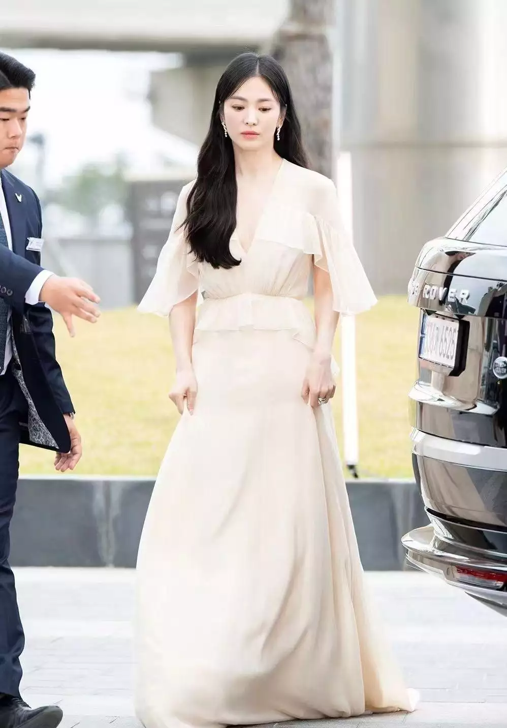 作为演员,在参与这种含金量比较高的大型活动中,着装还是很注重得体性和优雅感。所以与以往女明星在参加红毯时所穿的裙装相比在版型上还是相对较为保守,尤其是裙子,裙长和袖长的设计,直接就奠定了整体内敛的风格。而纯色系的选择也很好的迎合了当下的场合,而且与宋慧乔本人的气质也很贴合。