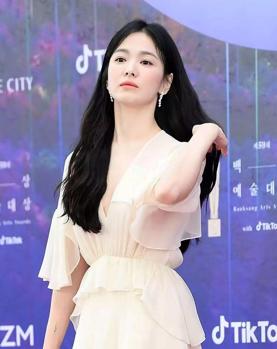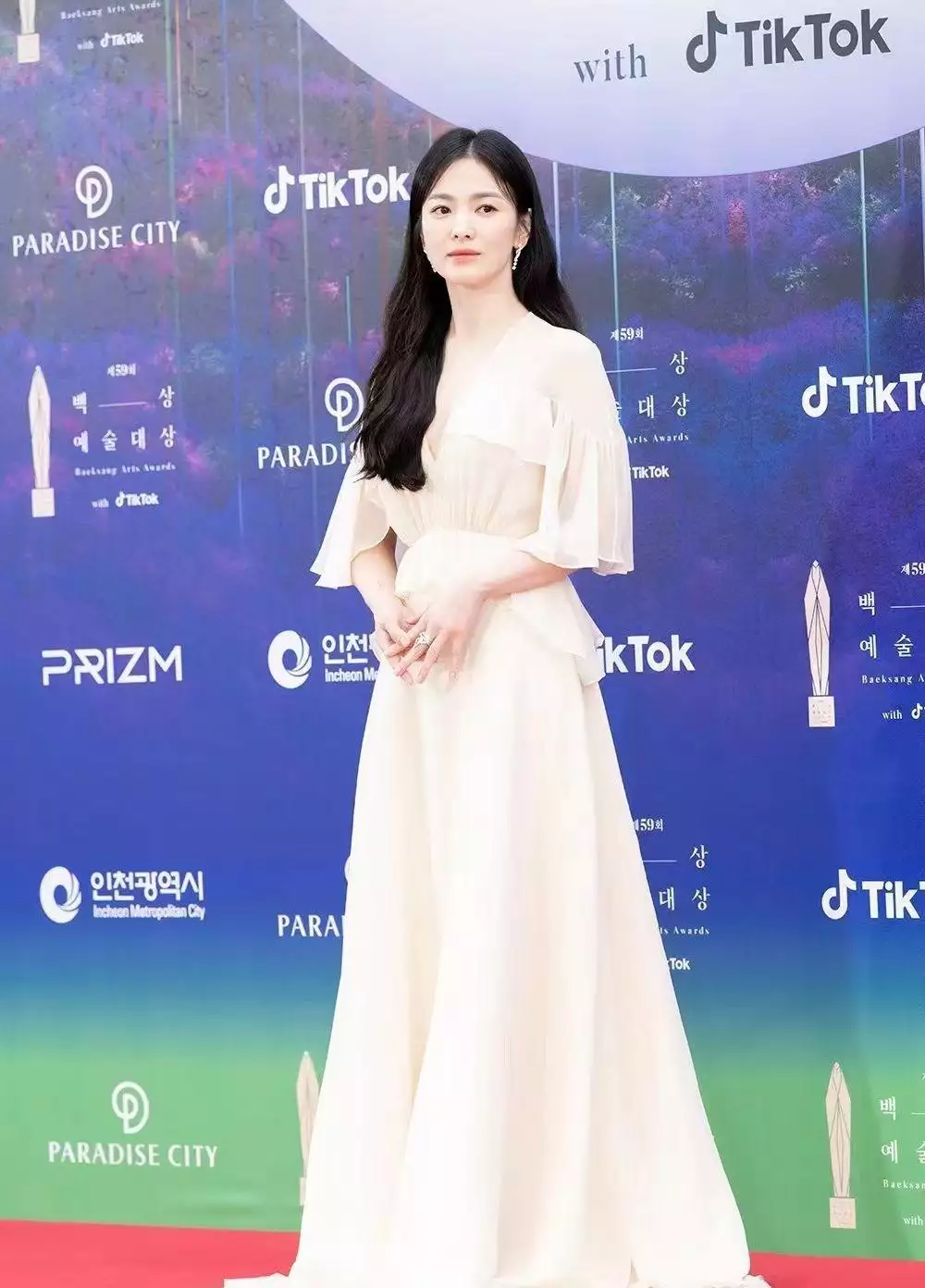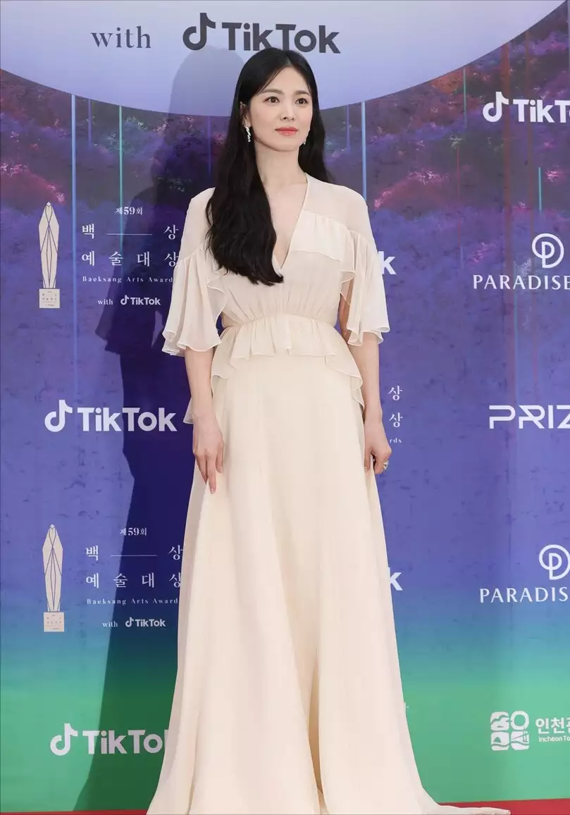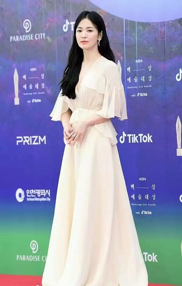女明星在参加重要场合时,着装多数以礼服裙为主,可以凸显出对场合的尊重,造型的视觉冲击力更强。作为韩国三大影视奖项之百想艺术大奖有着很高的含金量,宋慧乔出道多年,演过很多大爆的韩剧,从三次提名,但每次都擦肩而过。
